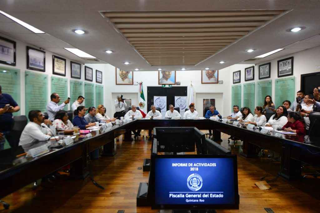 En la reunión, que fue encabezada por el diputado Eduardo Martínez Arcila, presidente de la Gran Comisión del Congreso del Estado y el diputado Carlos Mario Villanueva Tenorio, presidente de la Comisión de Justicia; el Fiscal General expuso el informe de actividades 2018, en el que muestra el panorama general de la institución.
