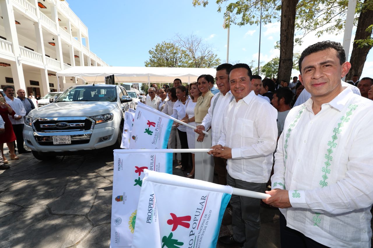 Chetumal.- “Juntos podemos avanzar en la atención de los rezagos de salud que afectan a los quintanarroenses”, señaló hoy el gobernador Carlos Joaquín al encabezar la entrega de vehículos, materiales y equipos, y dar el banderazo de afiliación y renovación de pólizas para acercar los servicios de salud a 614 mil 265 beneficiarios del Seguro Popular de los 11 municipios de la entidad.