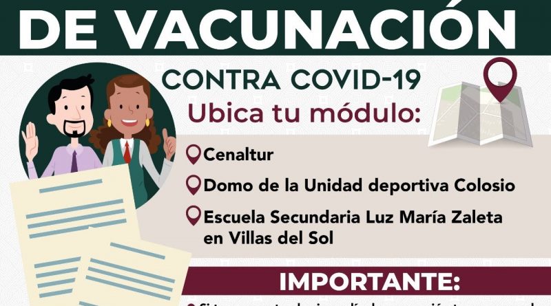 Este 8 y 9 de junio se llevará a cabo la aplicación de la segunda dosis de la vacuna Pfizer a adultos de 50 a 59 años en los módulos que estarán ubicados en CENALTUR, en el domo de la Unidad Deportiva de la colonia Colosio y en la secundaria Luz María Zaleta en Villas del Sol, a fin de dar continuidad al proceso de inmunización contra la Covid-19 que realiza la Secretaría del Bienestar con el apoyo del Gobierno de Solidaridad.