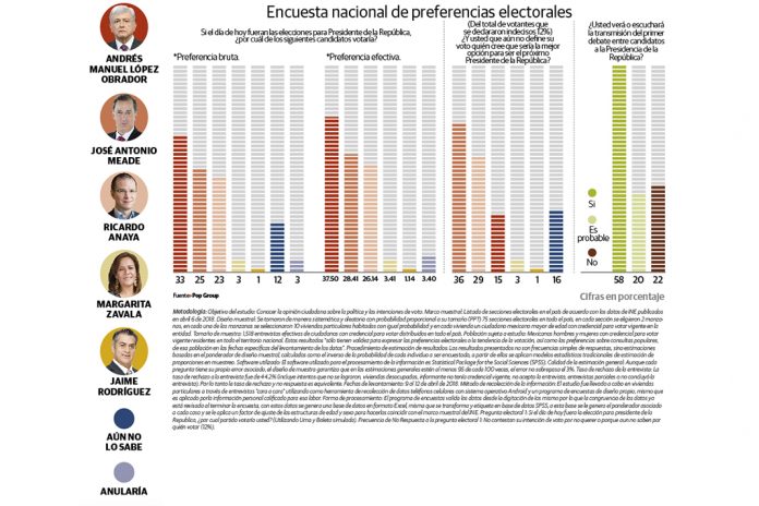 López Obrador se mantiene en primer lugar en preferencia bruta con 33%; lo siguen el candidato del PRI con 25% y el del Frente con 23%; el ejercicio demoscópico se realizó entre el 9 y el 12 de abril