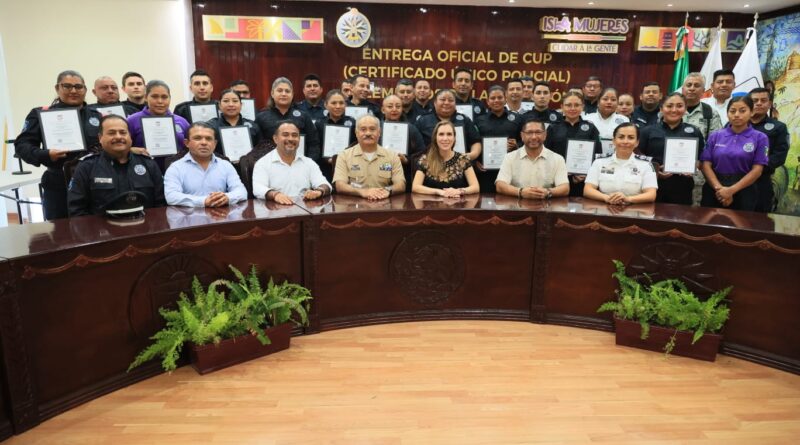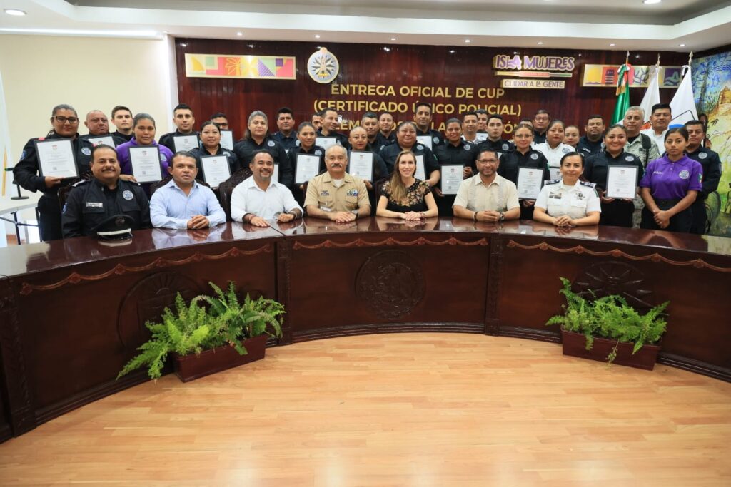 ISLA MUJERES, 14 DE JUNIO DE 2023.- La presidenta municipal de Isla Mujeres, Atenea Gómez Ricalde, hizo entrega a 30 policías municipales su Certificado Único Policial (CUP), con el cual se busca que la corporación cuente con elementos más confiables y mejor capacitados.
