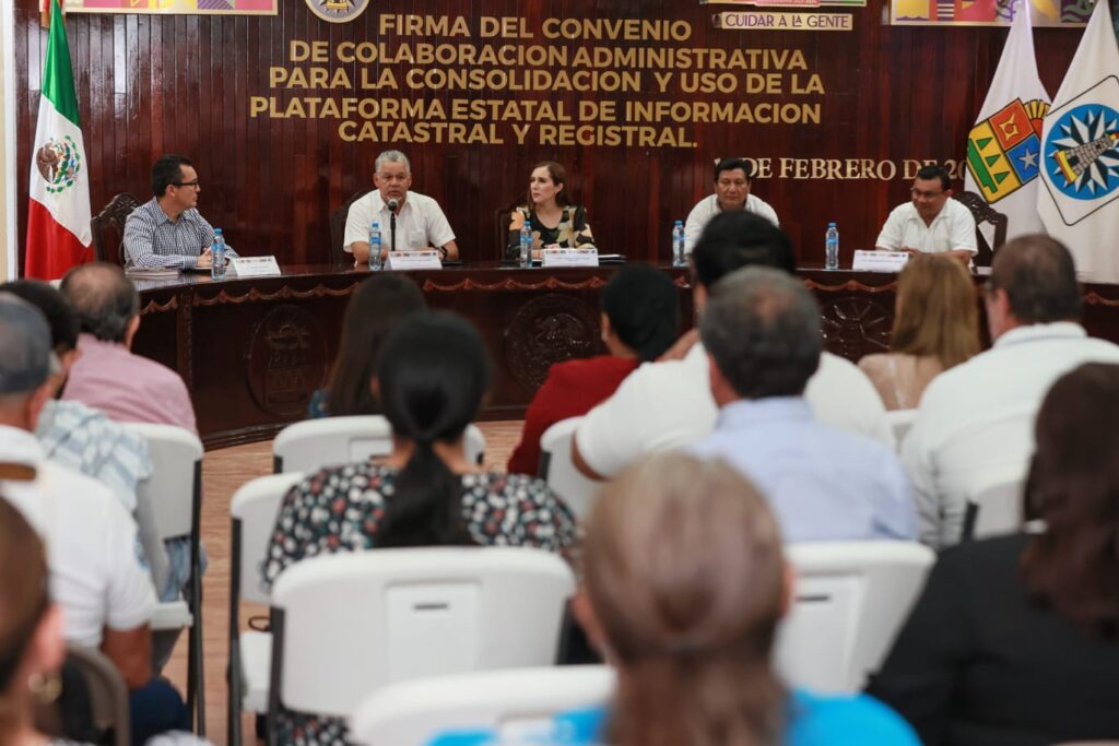 Isla Mujeres, Quintana Roo, 13 de febrero de 2023.- Con el firme propósito de garantizar la certeza jurídica en el patrimonio de las y los isleños para generar un desarrollo sustentable y ordenado en el municipio, la presidenta municipal de Isla Mujeres, Atenea Gómez Ricalde refrendó la firma del convenio de colaboración administrativa para la consolidación y uso de la plataforma estatal de información catastral y registral en la Sala de Cabildo del H. Ayuntamiento de Isla Mujeres.