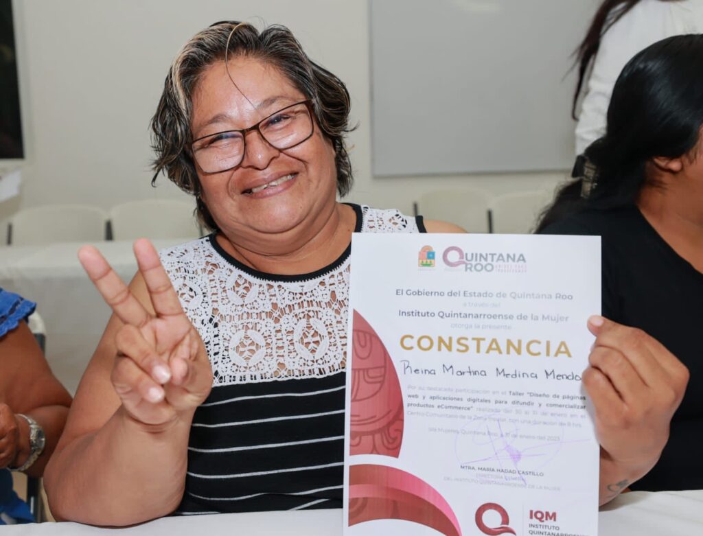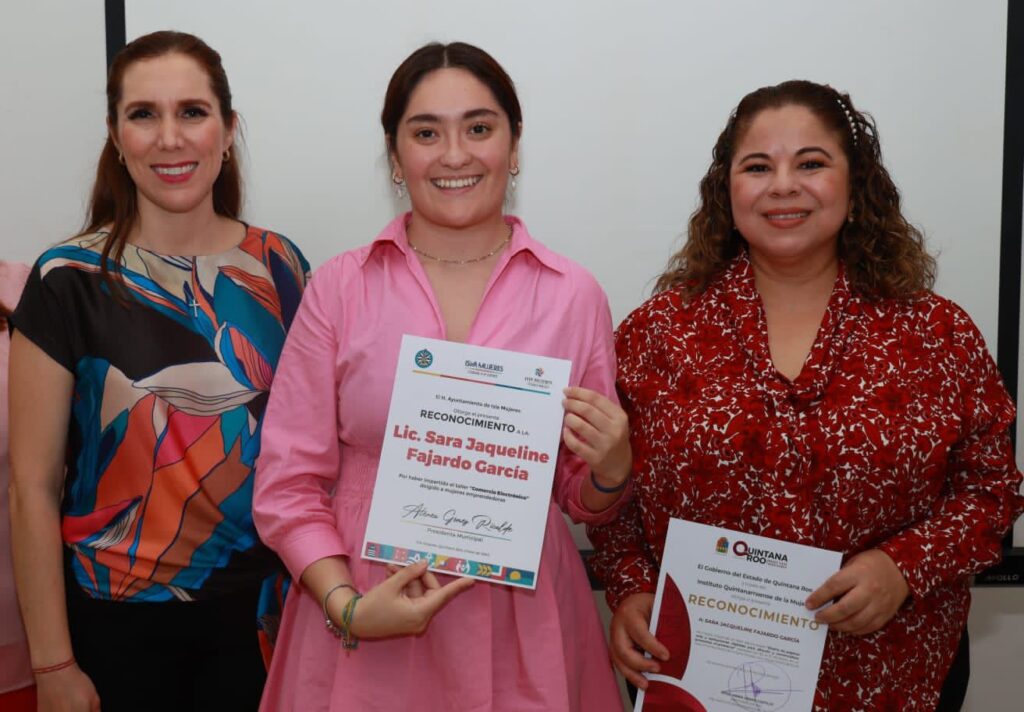 La alcaldesa isleña y la titular del IQM María Hadad Castillo, clausuraron el taller Taller de Comercio Electrónico y entregaron reconocimientos a quienes cursaron esta capacitación que tuvo la finalidad de brindarles a las mujeres herramientas y conocimientos para que puedan comercializar sus productos a través de plataformas digitales y páginas web.