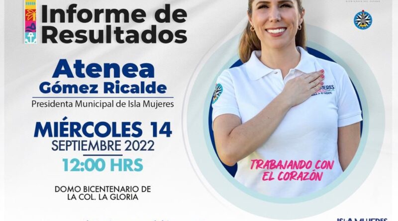 Isla Mujeres, Quintana Roo, 13 de septiembre de 2022.-Con la finalidad de transparentar las acciones que ha realizado el gobierno en este primer año, la presidente municipal, Atenea Gómez Ricalde, invitó a la ciudadanía a su Primer Informe de Resultados mañana miércoles 14 de septiembre a las 12 del día en el Domo Bicentenario.