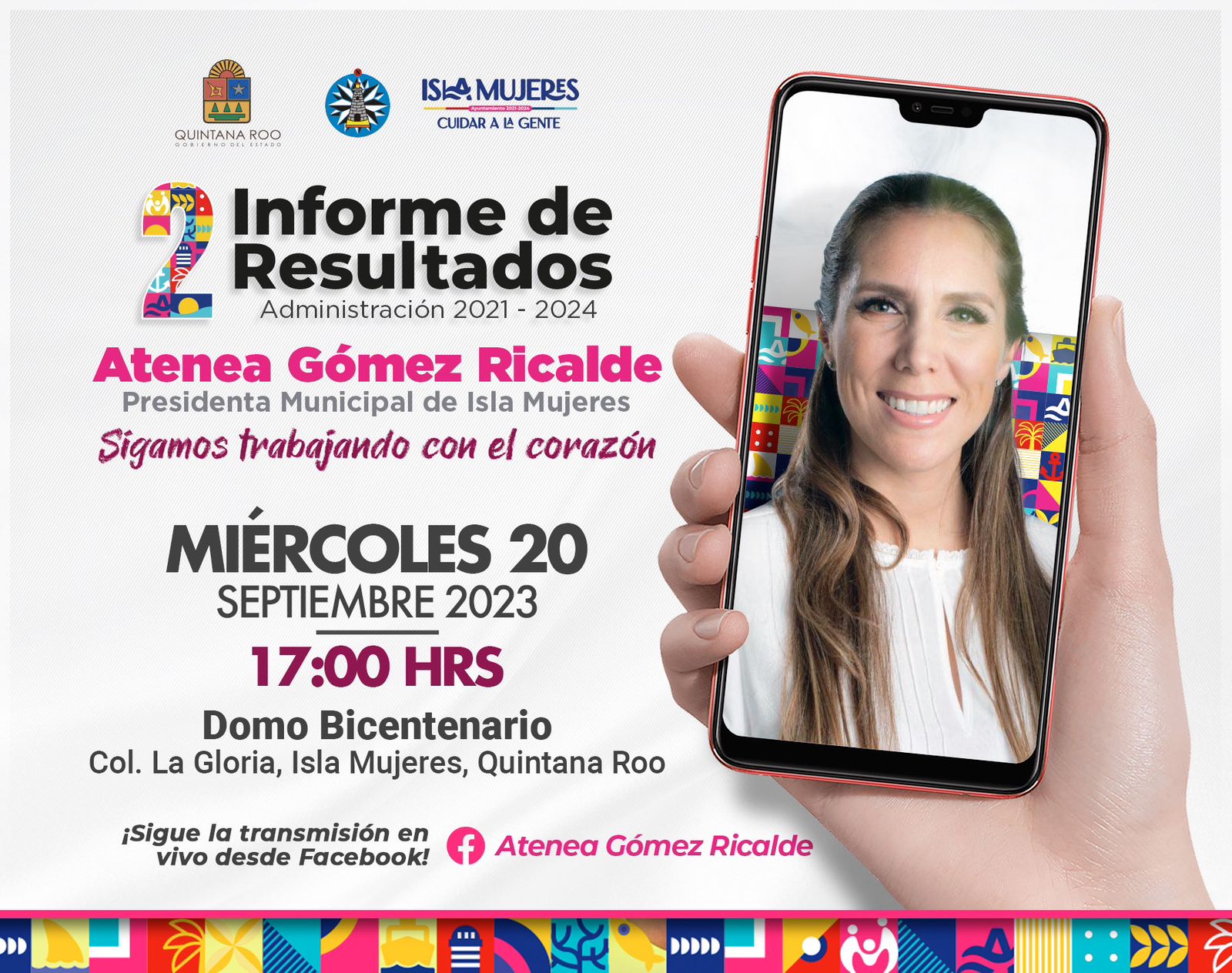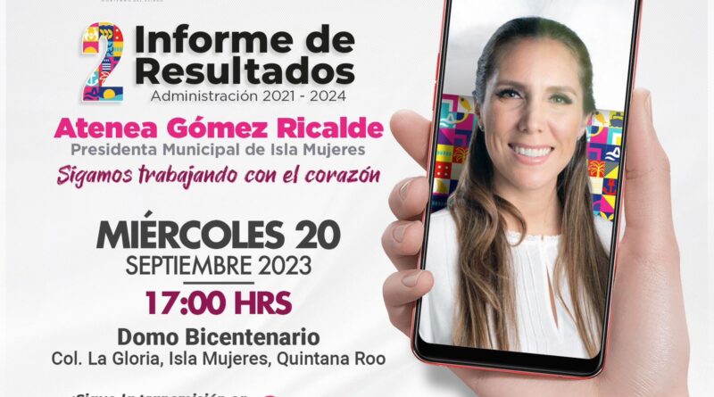 Isla Mujeres, Quintana Roo, 13 de septiembre de 2023.- La presidenta municipal de Isla Mujeres, Atenea Gómez Ricalde, invitó a las isleñas y los isleños al Segundo Informe de Resultados de su Administración 2021-2024 que presentará el próximo miércoles 20 de septiembre a las 17:00 horas en el Domo Bicentenario de la colonia La Gloria, en la Zona Insular del municipio.