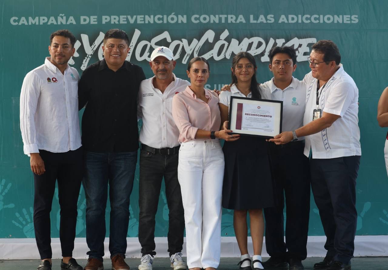 Cancún, Q. R., a 06 de mayo de 2025.- Con gran entusiasmo la Presidenta Municipal, Ana Paty Peralta, otorgó el reconocimiento “Yo no soy Cómplice” al Colegio de Bachilleres Plantel Cancún 2, por su destacada colaboración en esta campaña que encabeza el Instituto Municipal Contra las Adicciones (IMCA), así como por su compromiso por la promoción de un entorno positivo y saludable.