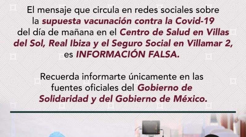 A nombre de la presidenta municipal, Laura Beristain Navarrete, el secretario general del Ayuntamiento, Alfredo Paz Cetina, y el director de Salud Física y Mental, Héctor González Rodríguez, desmintieron que se esté realizando la vacunación en estos momentos, e hicieron un llamado a la ciudadanía a mantenerse informada en los canales oficiales. El director de Salud Física y Mental, Héctor González Rodríguez mencionó que, por parte del gobierno municipal, se está implementando toda la metodología para que una vez que las dosis arriben a Quintana Roo, estén dadas las condiciones para su resguardo y manipulación, tomando en cuenta que deben estar bajo cierta temperatura.