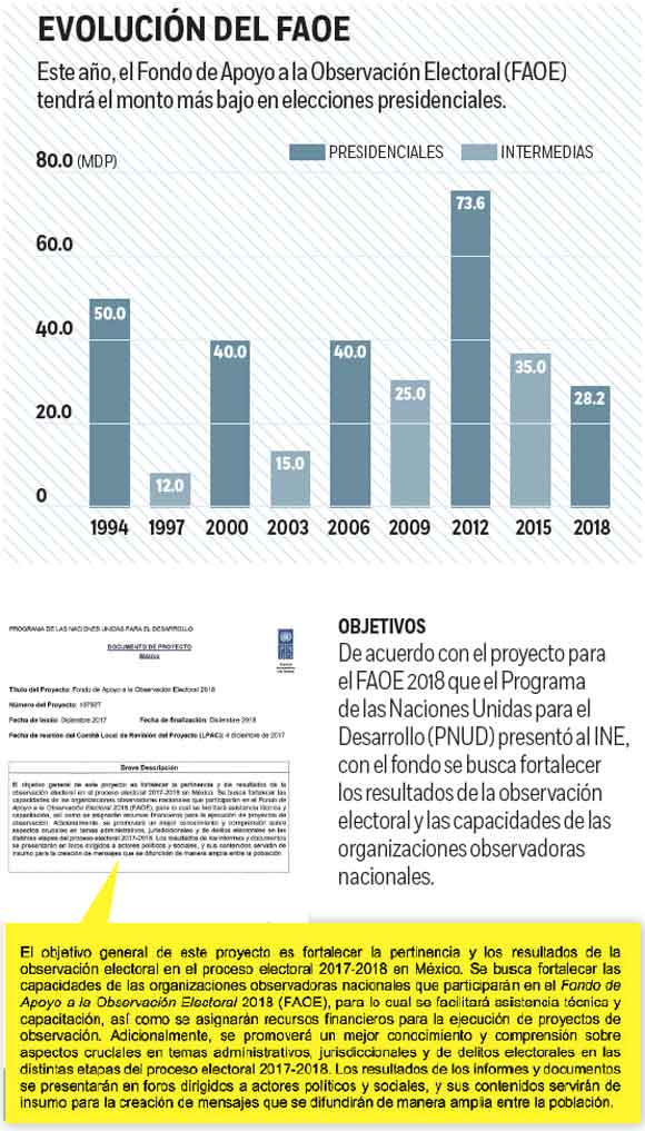 El monto para observación electoral previsto para este año es el más bajo que se ha destinado para comicios en que se elegirá Presidente de la República, de acuerdo con información del INE y el Programa de las Naciones Unidas para el Desarrollo (PNUD), que desde 1994 participa en la administración de los recursos destinados a la vigilancia electoral en nuestro país.