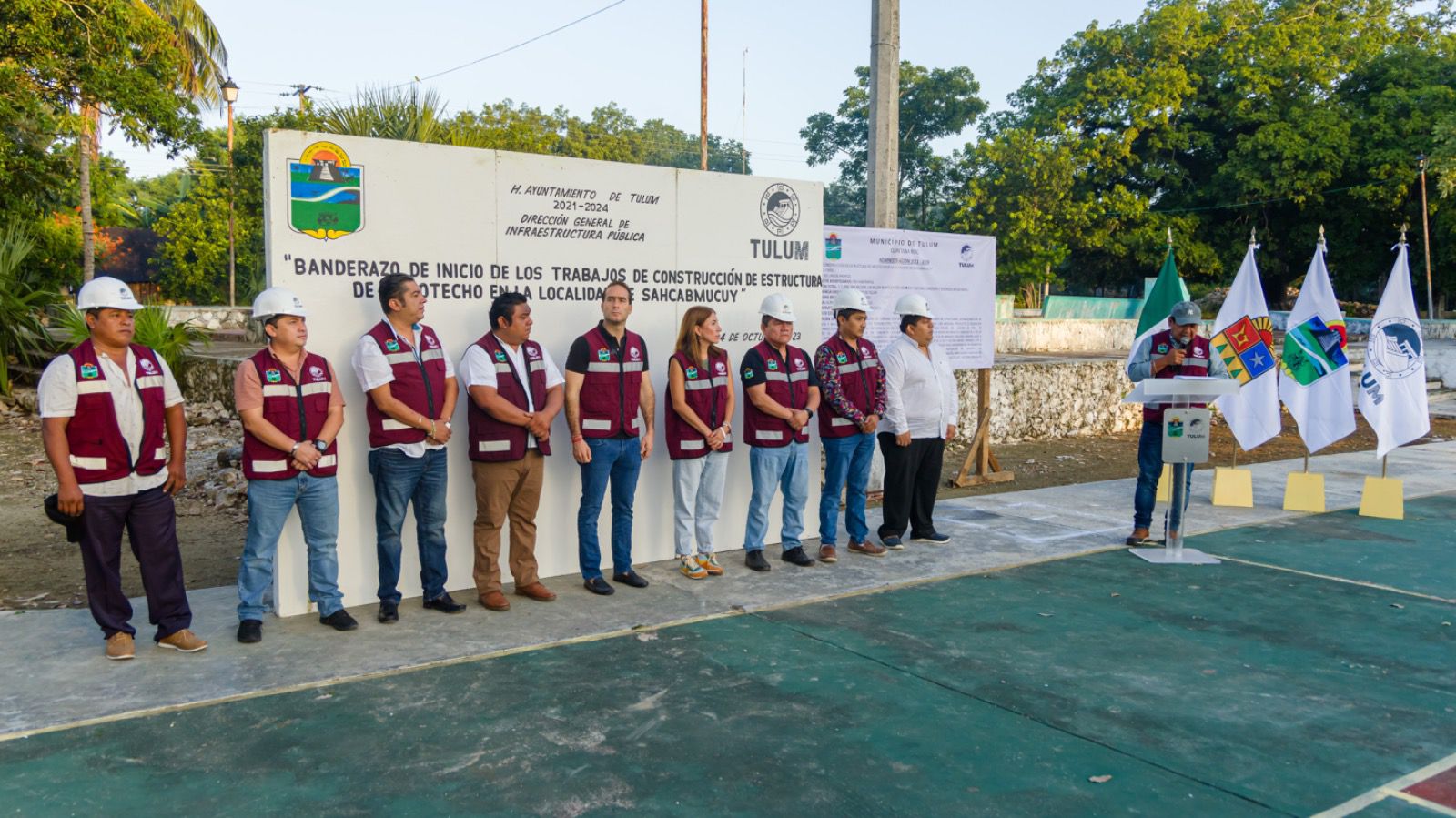 Tulum, 4 octubre del 2023.- El Presidente Municipal, Diego Castañón Trejo puso en marcha los trabajos para la construcción de la estructura del arcotecho en la localidad de Sahcabmucuy.