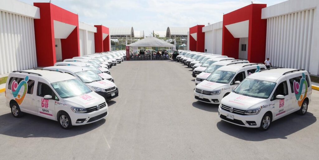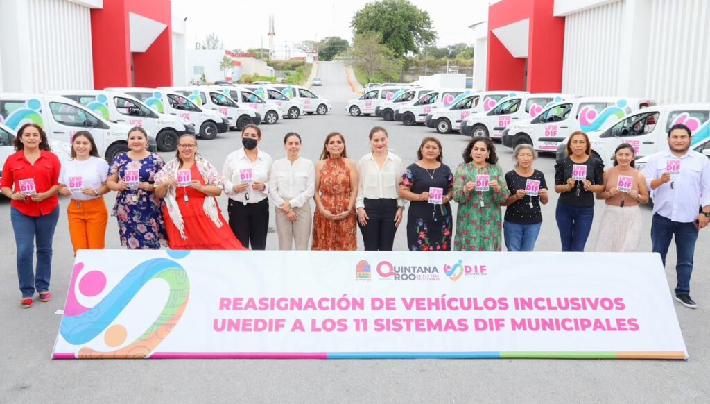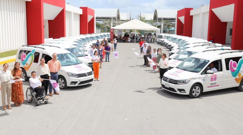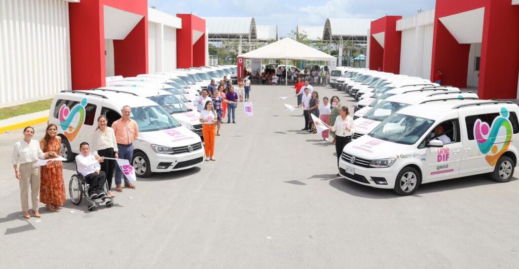 Cancún.- Como parte de las acciones del Nuevo Acuerdo por el Bienestar y Desarrollo de Quintana Roo, que impulsa la gobernadora Mara Lezama Espinosa a través de la Presidenta del Sistema DIF Quintana Roo, Verónica Lezama Espinosa se realizó la re distribución, asignación y entrega de 32 vehículos inclusivos a representantes de los 11 DIF municipales, con el objetivo de eficientar el traslado, atención y servicio de las personas mayores, con discapacidad y limitación de la movilidad.