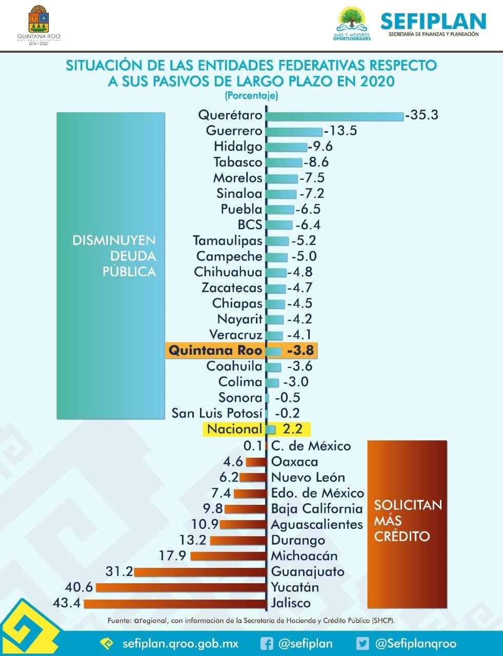 El gobernador Carlos Joaquín privilegia el manejo honesto de los recursos, de manera transparente, y como resultado de ello este día la titular de la Secretaría de Finanzas y Planeación (SEFIPLAN) Yohanet Torres Muñoz, informó que Quintana Roo ha presentado una reducción neta de sus pasivos de largo plazo que representa 733.2 millones de pesos durante 2020, de acuerdo a un estudio de la Consultora Aregional.