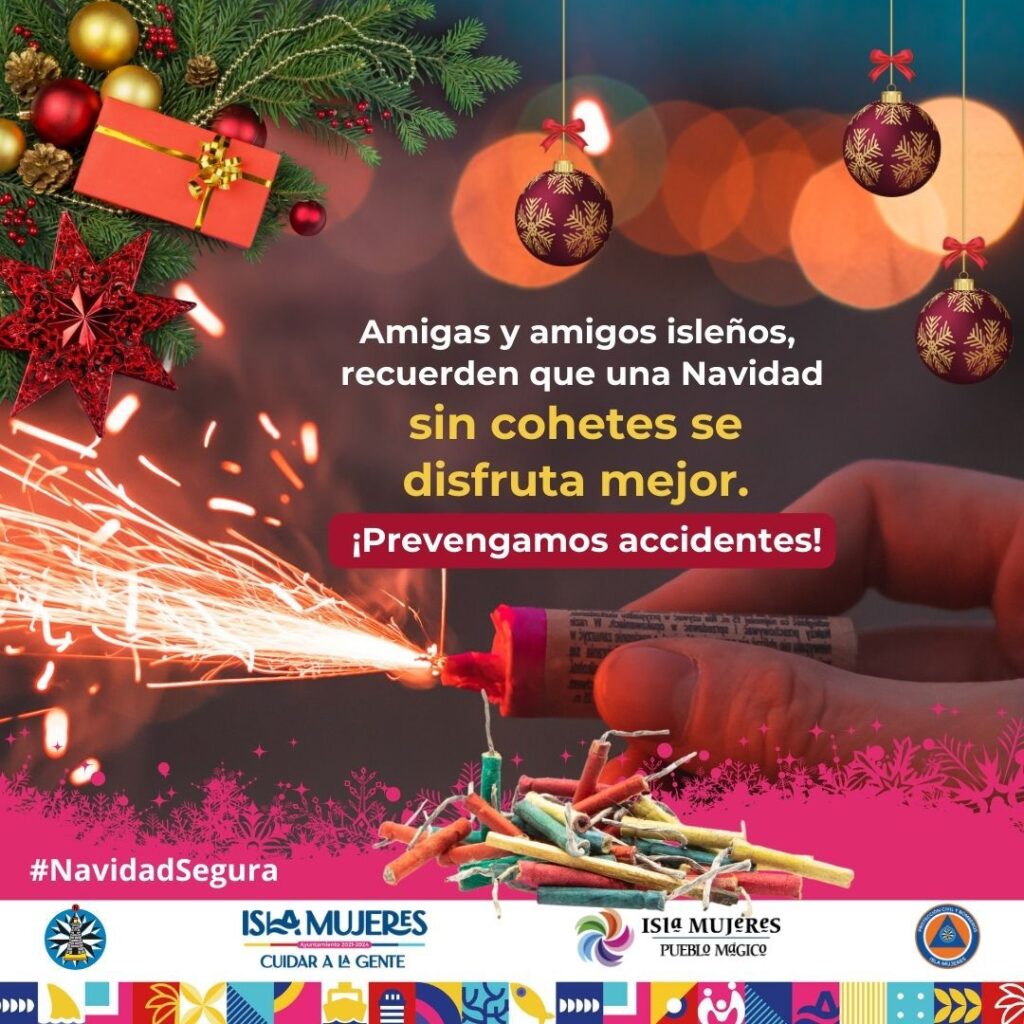 Isla Mujeres, Quintana Roo, 15 de diciembre de 2023.- Con el firme compromiso de cuidar a la gente y prevenir accidentes en estas Fiestas de Navidad y Fin de Año, el Gobierno Municipal que encabeza la alcaldesa Atenea Gómez Ricalde, a través de la Dirección de Protección Civil y Bomberos de Isla Mujeres, emitió algunas recomendaciones tanto para la ciudadanía como para los miles de turistas que visitan Isla Mujeres en estas fechas.