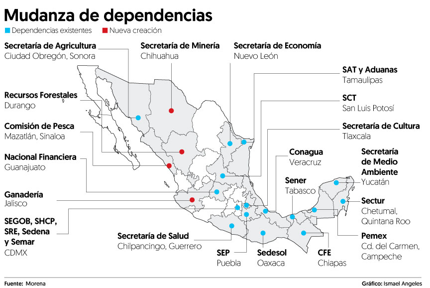 Se espera que durante 2019 se tengan las primeras dependencias laborando en otros estados, aunque algunas como la Secretaría de Gobernación (Segob) y la Secretaría de Relaciones Exteriores (SRE) permanecerán en la capital del país.