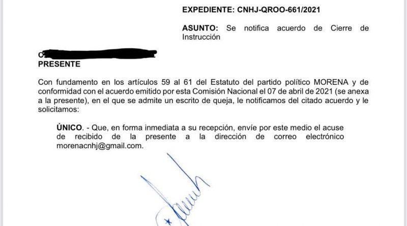 Tulum, Quintana Roo.- La Comisión Nacional de Honestidad y Justicia de Morena dió entrada a la impugnación promovida contra la candidatura de Marciano Dzul Caamal a la presidencia municipal de Tulum.