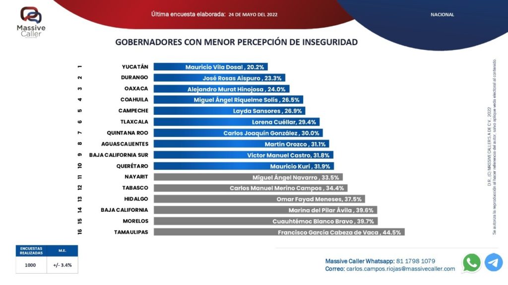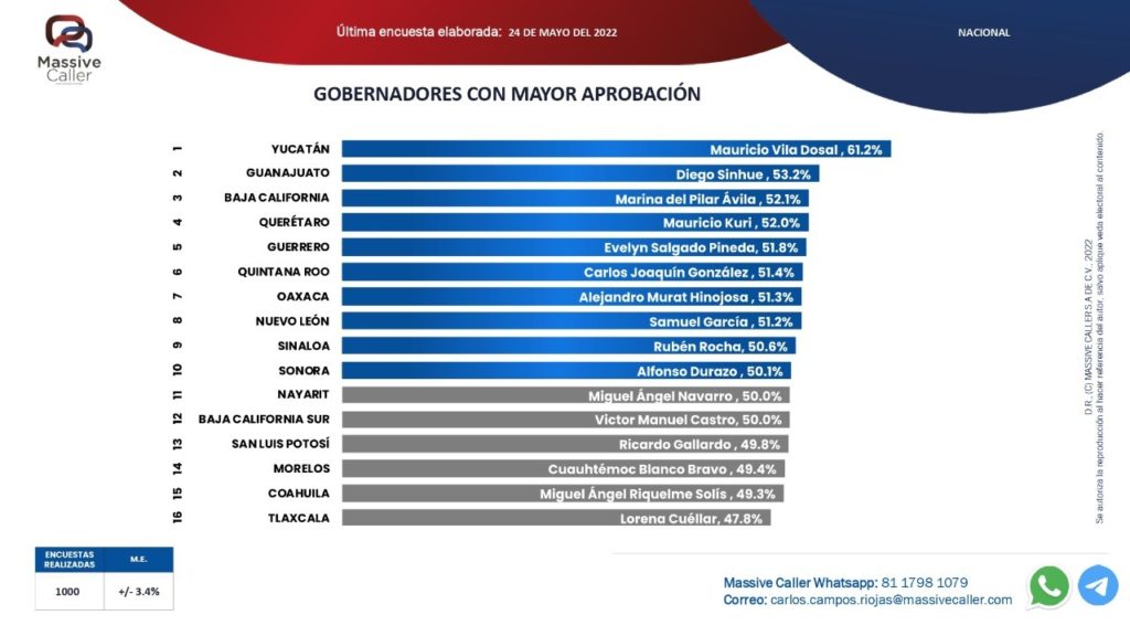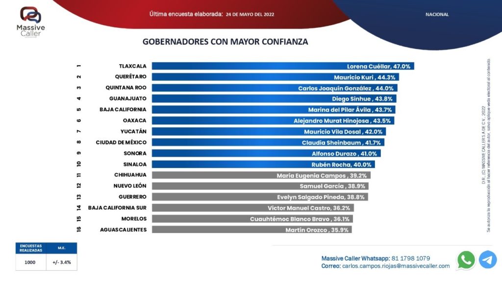 Chetumal.- La última medición mensual de Massive Caller, del 24 de mayo pasado, ubicó al gobernador de Quintana Roo Carlos Joaquín en la tercera posición entre los primeros 10 gobernadores con mayor confianza.