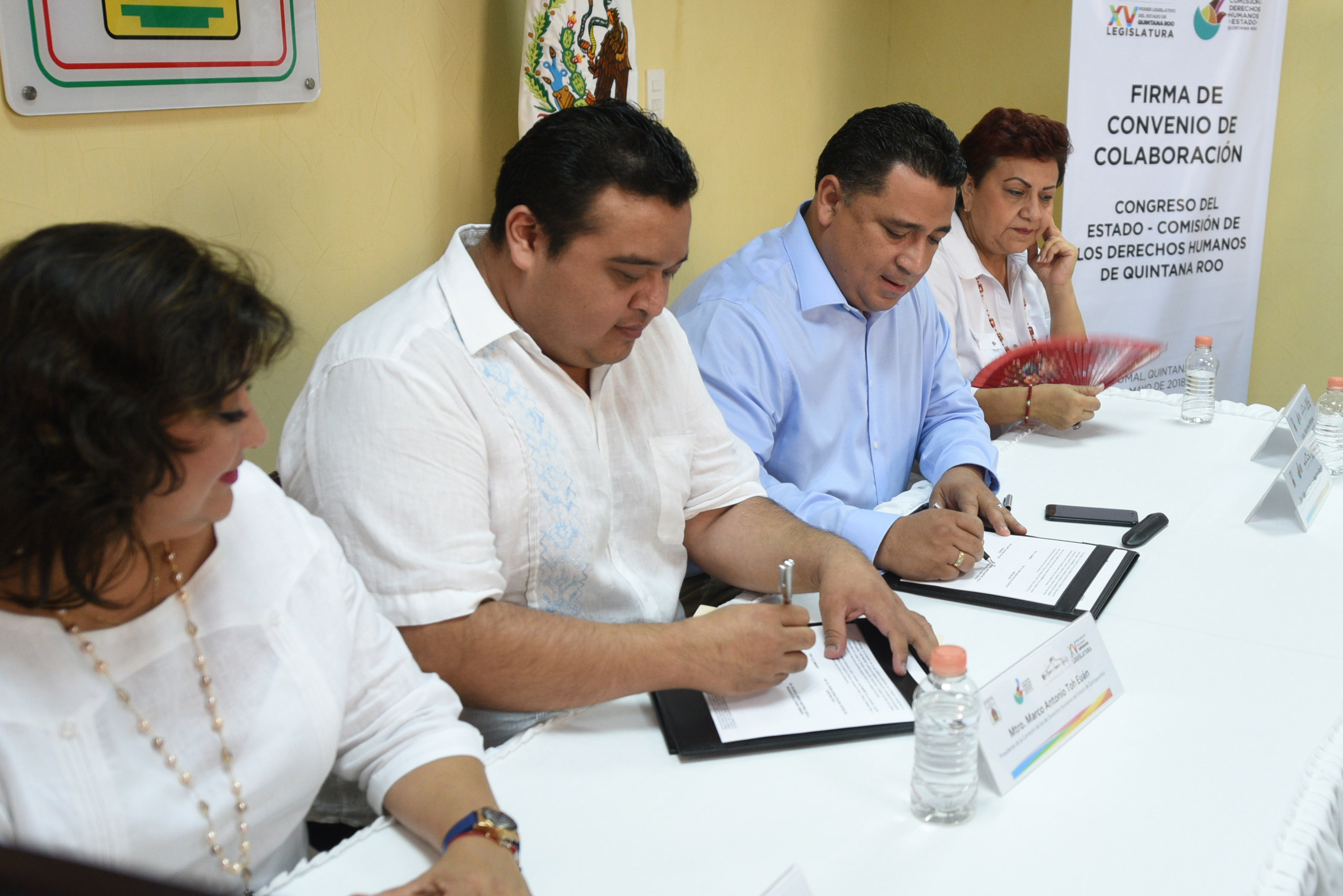 El presidente de la Gran Comisión del Congreso Eduardo Martínez Arcila y el ombusdperson Marco Antonio Toh Euán, fueron los encargados de signar este convenio de colaboración que busca reforzar, respetar, proteger, garantizar y promover los derechos humanos entre los servidores públicos del Poder Legislativo y la sociedad quintanarroense.