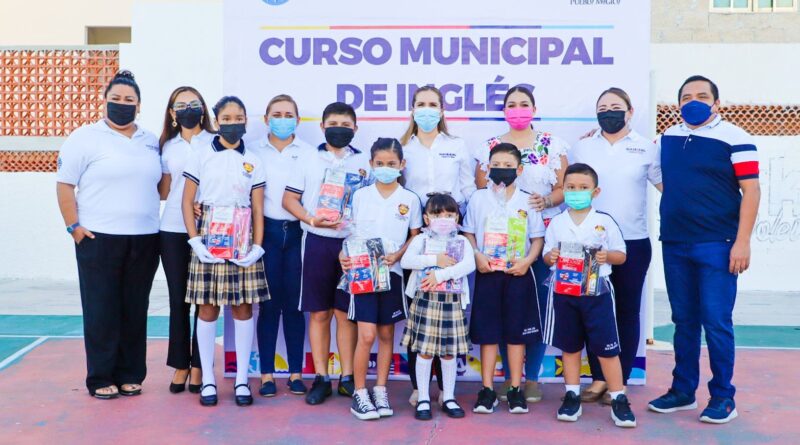 En apoyo a la economía familiar, Gómez Ricalde entregó kits escolares que contienen libreta, diccionario, sacapuntas, lapiceros, lápiz y borrador, para que las niñas y los niños tengan los materiales necesarios para sus clases de inglés.