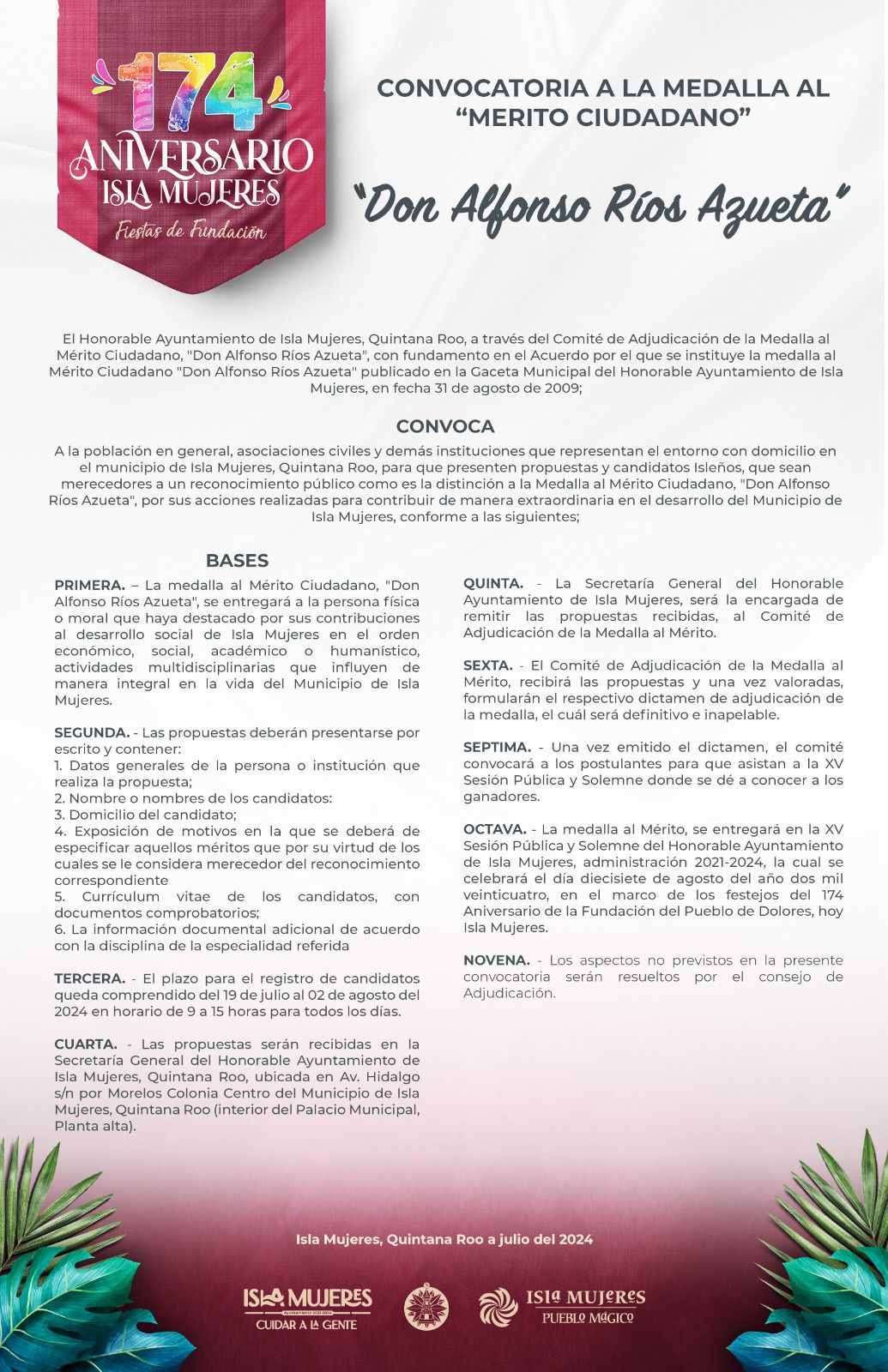 El próximo 17 de agosto, Isla Mujeres celebrará el 174 aniversario de su fundación y como ya es costumbre, en ese marco, serán entregadas las medallas al Mérito Turístico “Lic. José de Jesús Lima Gutiérrez”, al Mérito Ciudadano “Don Alfonso Ríos Azueta” y a la condecoración como la más alta distinción “Diosa Ixchel”.