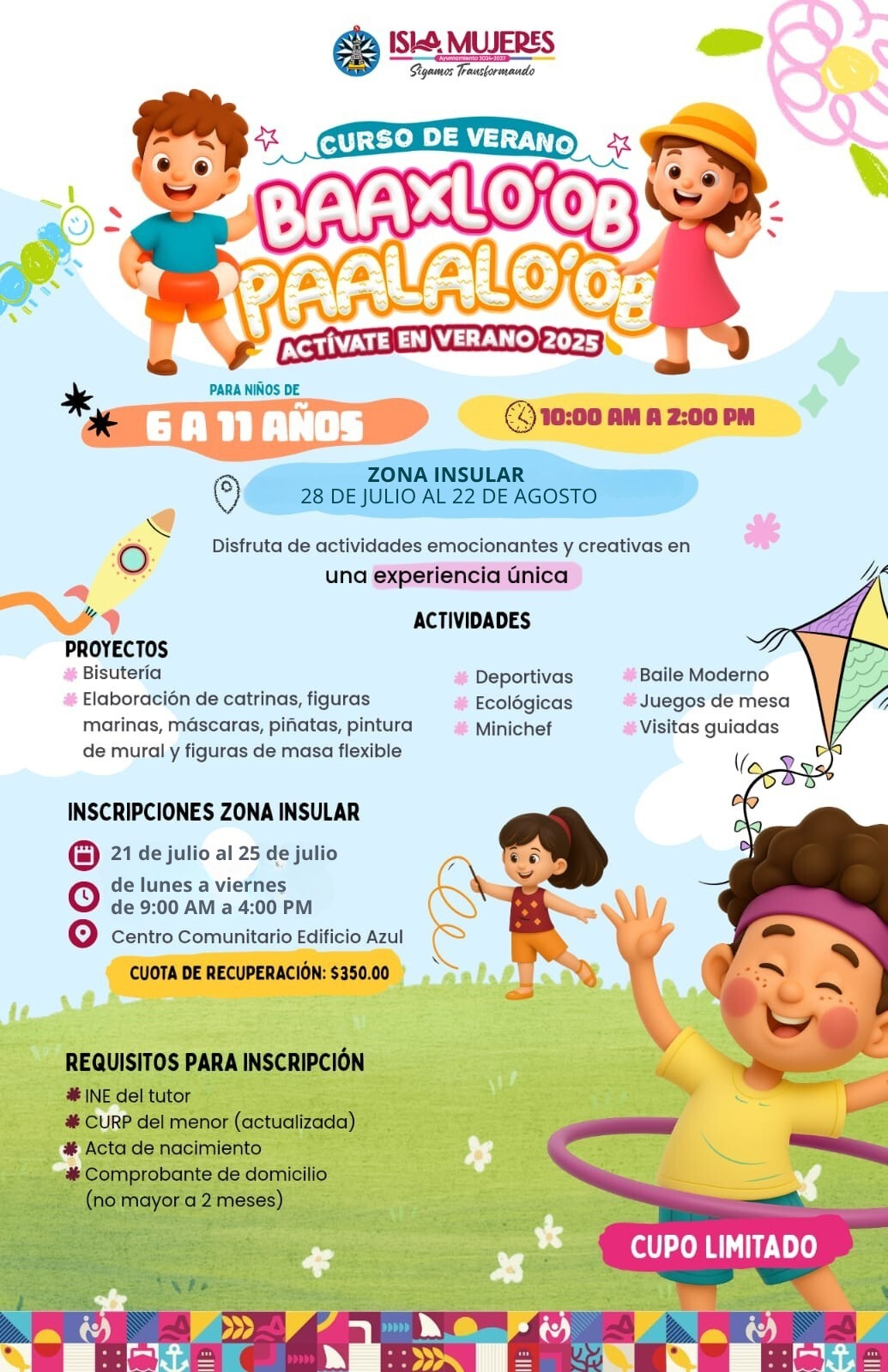 Isla Mujeres, Quintana Roo a 12 de julio de 2025. – Con el objetivo de brindarles a las niñas y niños isleños, espacios de recreación durante las vacaciones, el Gobierno de Isla Mujeres, que encabeza la Presidenta Municipal, Atenea Gómez Ricalde, invita a las madres y padres de familia a inscribir a sus hijas e hijos al Curso de Verano Baaxlo’ob Paalalo’ob.