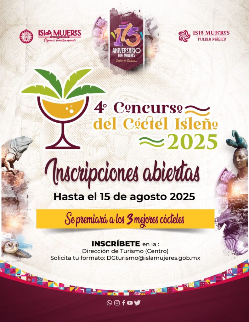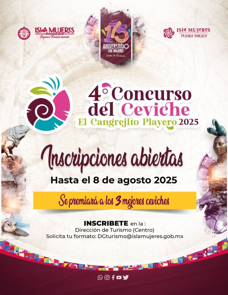 Isla Mujeres, Quintana Roo a 4 de agosto de 2025.-El Gobierno de Isla Mujeres, que encabeza la Presidenta Municipal, Atenea Gómez Ricalde, invita a las isleñas e isleños a participar en la cuarta edición del Concurso del Ceviche “El Cangrejito Playero” 2025 y el Concurso del Cóctel Isleño 2025.