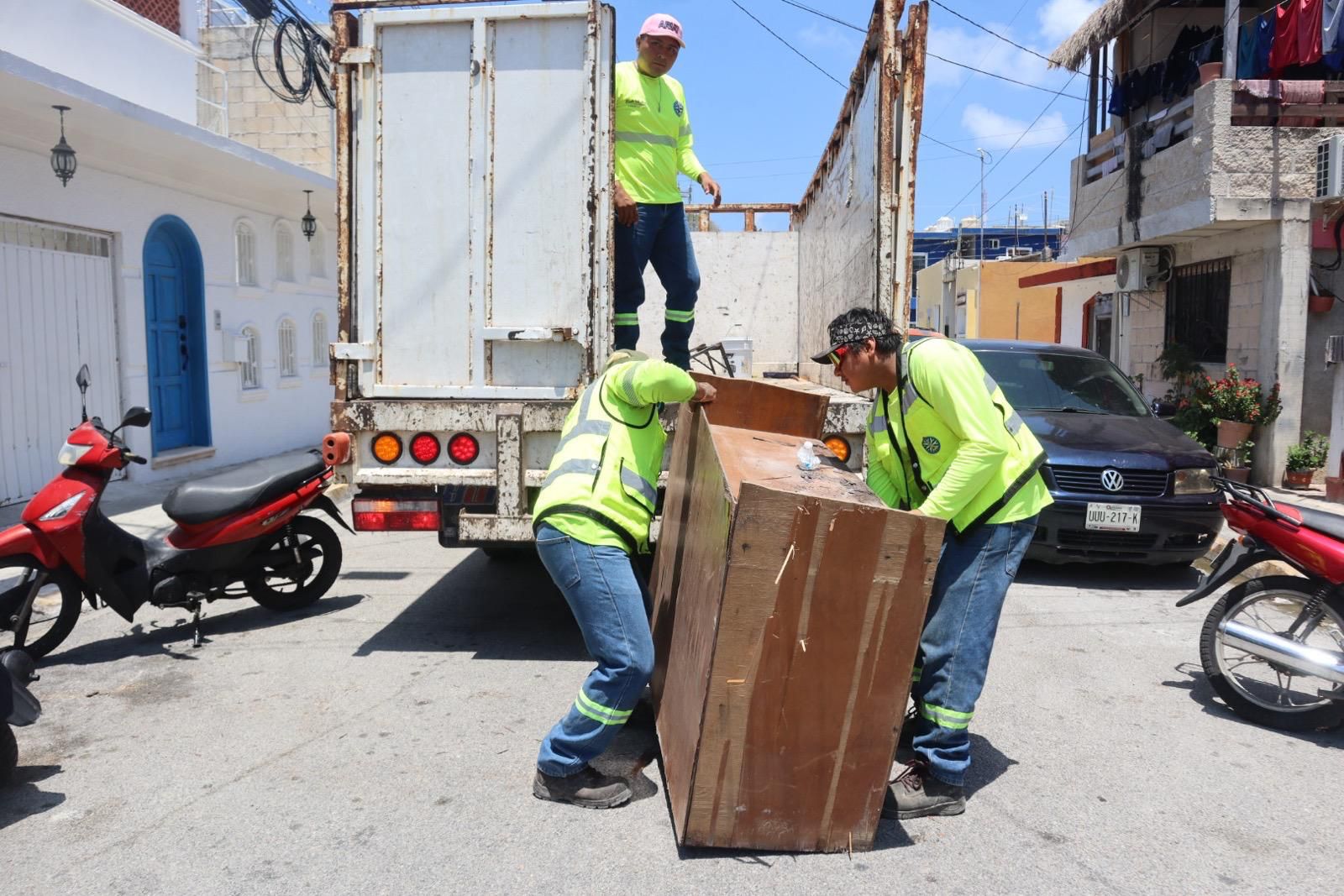 En la Isla, las brigadas de limpieza recorrieron las colonias Electricistas y La Caribeña, recolectando cacharros, objetos inservibles y residuos voluminosos acumulados en patios y azoteas.