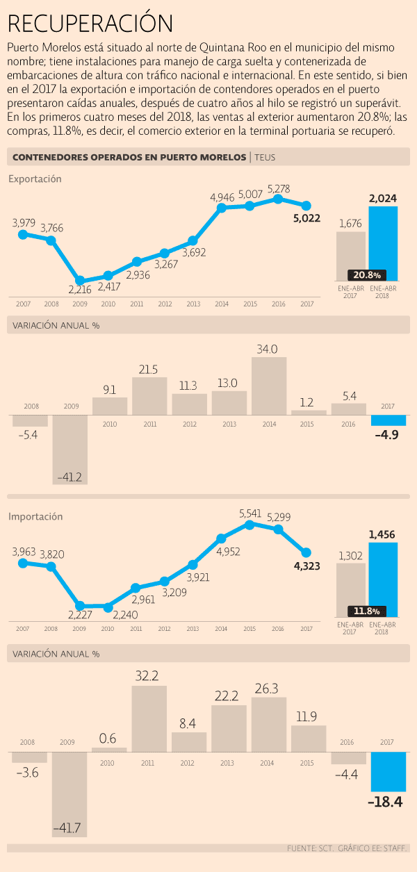 Según las estadísticas que elabora la Apiqroo, Puerto Morelos ya movilizó a mayo de este año 15,478 toneladas de carga en contenedores, que representan un crecimiento de 5.2% a tasa anual y se espera que al final del año tenga un incremento de 15 por ciento.