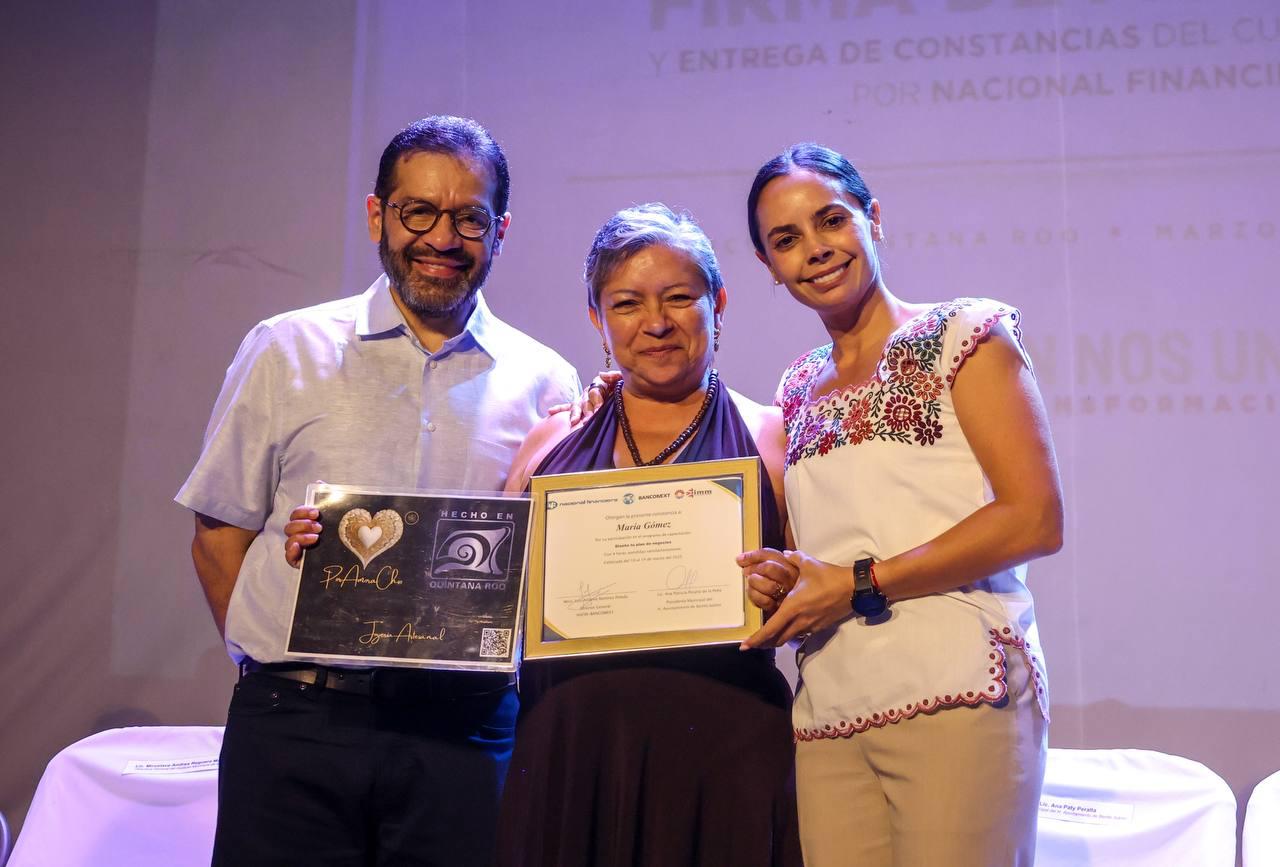 Cancún, Q. R., a 19 de marzo de 2025.- Además de entregar constancias por el curso impartido en beneficio de sus finanzas a través del programa “Ellas Facturan”, la Presidenta Municipal, Ana Paty Peralta, firmó un convenio de colaboración con Nacional Financiera (NAFIN), para seguir impartiendo asesorías que permitan impulsar a mujeres emprendedoras cancunenses y fortalecer la economía de Cancún.