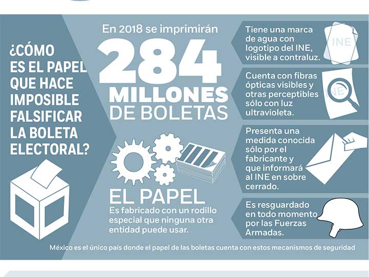 “Primero, es un documento que se imprime sobre un papel que se genera a partir de un rodillo que es propiedad del propio Instituto Nacional Electoral. Nosotros hemos comprado ese rodillo, está en una empresa que es la responsable de fabricar ese papel en el estado de Chihuahua y ese papel se produce con las primeras medidas de seguridad. El gramaje es especial, no es un gramaje comercial, no es el grosor de una hoja de papel bond que podemos adquirir en cualquier papelería; en segundo lugar viene ya con fibrillas ópticas, es decir, pequeños componentes de color que se incluyen en el papel y que es visible al ojo humano y hay otras fibrillas que sólo se advierten con luz ultravioleta”, añadió.