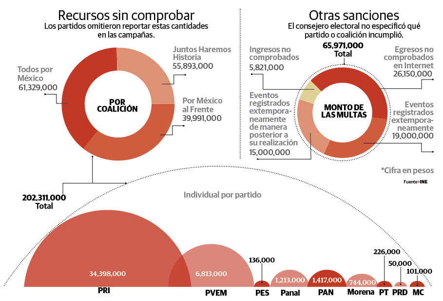 De los 202 millones de pesos de gastos no reportados al órgano electoral, 55 millones 893 mil pesos son de la coalición Juntos Haremos Historia; 61 millones 329 mil pesos de Coalición Todos por México, y 39 millones 991 mil pesos pertenecen a la Coalición Por México al Frente.