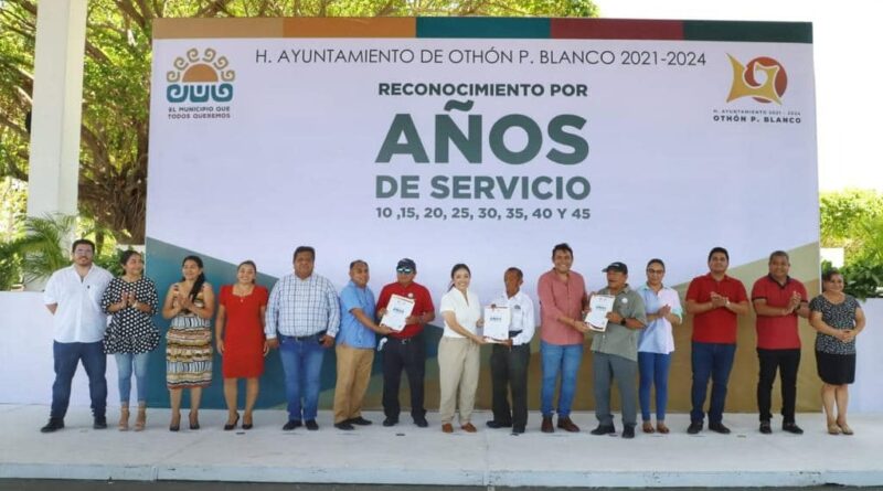 Chetumal, Q. Roo a 13 de junio.- “Estos años no pasan desapercibidos para nosotros, su vida de entrega no pasa desapercibida. El pasado viernes pagamos puntualmente el bono por años de servicio como no había pasado durante muchos años”, expresó la presidenta municipal de Othón P. Blanco, Yensunni Martínez Hernández, en el marco del evento protocolario de reconocimientos al personal que cumplió de los 10 a los 45 años de servicio en la administración othonense.