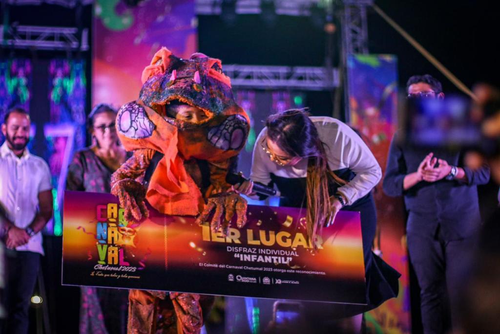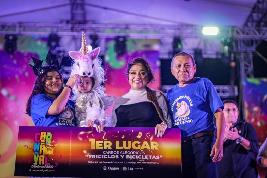 Asimismo, en la categoría de triciclos, primer lugar, “Unicornios”; en disfraz de mascotas, “Alux Negro”; disfraz individual infantil, “Iguana”; disfraz individual libre, “Super Tanque”; traje espectacular, “Fantasía Las Vegas”; disfraz grupal infantil, “Icónico”; y disfraz grupal libre, “Toro Mecánico”.
