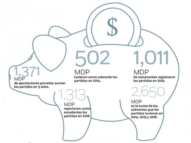 En esos tres años, los partidos tuvieron aportaciones privadas por mil 371.4 millones de pesos, por lo que, al restar este dinero de los remanentes totales, suponiendo que sólo gastaron dinero público, la cifra de los cochinitos asciende a mil 279 millones de pesos.