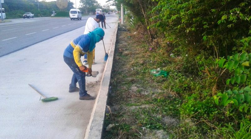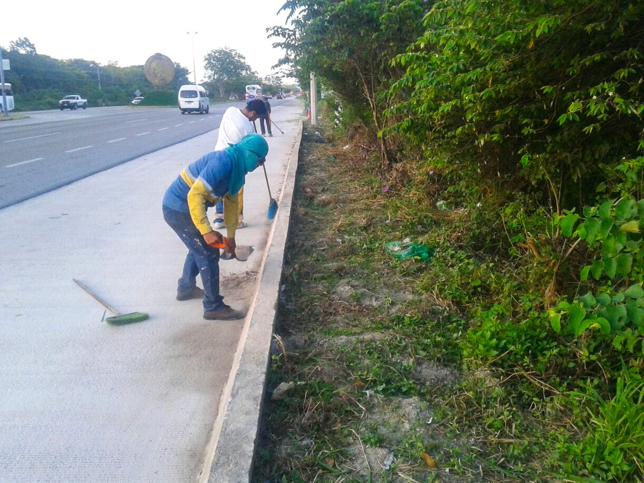 Las cuadrillas de limpieza también trabajan sobre el camellón y la parte lateral de la carretera federal, en la parte sur, hasta el límite con Tulum, y en la zona norte hasta la colindancia con Puerto Morelos.