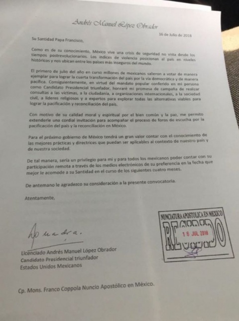 El virtual presidente electo, Andrés Manuel López Obrador, envió una carta al Papa Francisco para invitarlo formalmente a participar en los foros por la paz que se llevarán a cabo a partir del 7 de agosto.