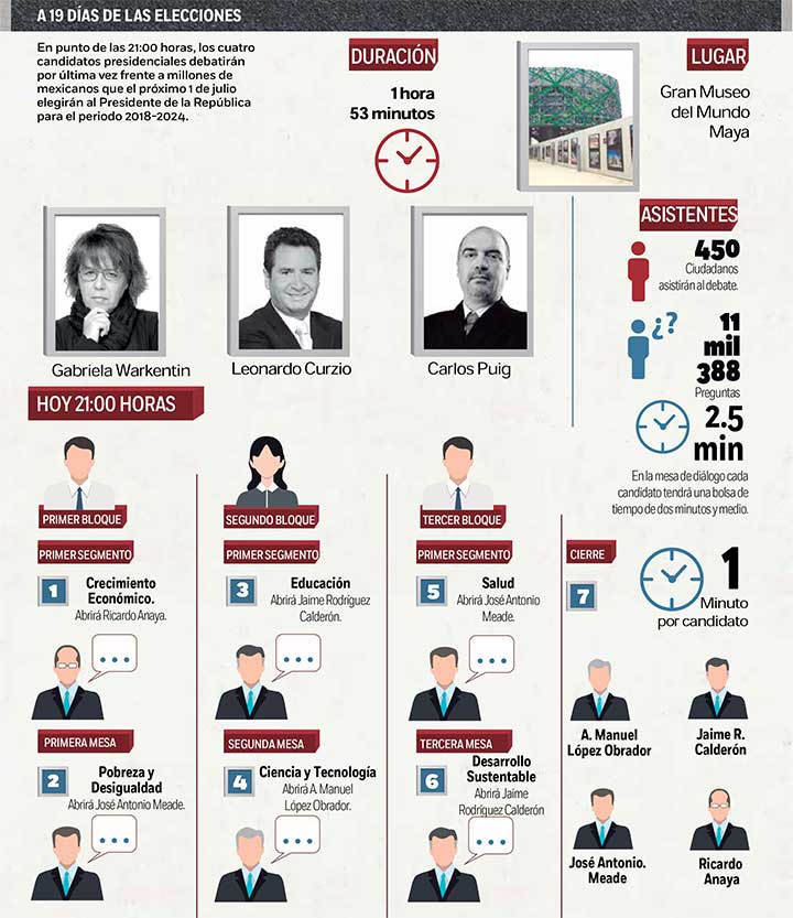 Gabriela Warkentin, Leonardo Curzio y Carlos Puig moderarán y serán los encargados de seleccionar las preguntas de las redes sociales; en esta ocasión, los cuestionamientos serán personalizados y no generalizados como en los debates anteriores.