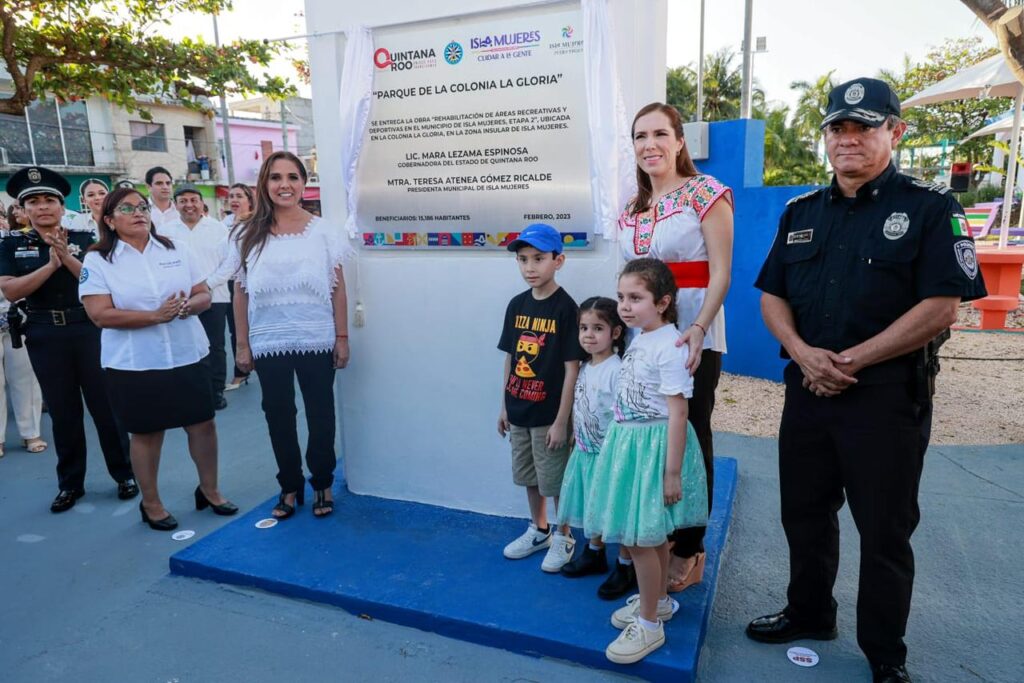 Isla Mujeres 1 de febrero de 2023. – La Gobernadora del Estado, Mara Lezama Espinosa y la Presidente Municipal, Atenea Gómez Ricalde, hicieron entrega oficial del renovado parque de la colonia La Gloria, el cual se suma a los más de 10 espacios públicos rescatados hasta el momento por la presente administración municipal, en donde se invirtieron más de 3.8 millones de pesos.