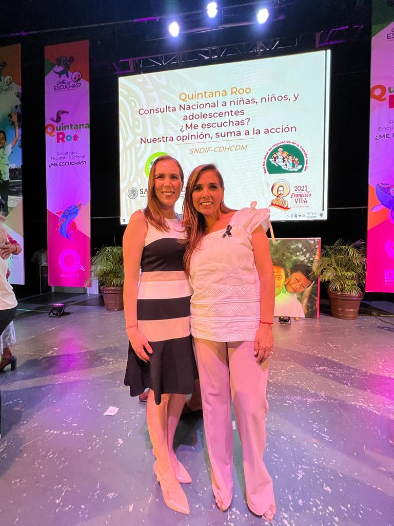 Isla Mujeres, Quintana Roo, 6 de marzo de 2023.- La Gobernadora de Quintana Roo, Mara Lezama Espinosa y la presidenta municipal de Isla Mujeres, Atenea Gómez Ricalde, suman voluntades al asistir a la presentación de resultados estatales de la Consulta Nacional ¿Me escuchas 2022? convocada por el Sistema DIF Nacional y efectuada por el DIF Quintana Roo en coordinación con el Instituto Quintanarroense de la Juventud (IQJ).