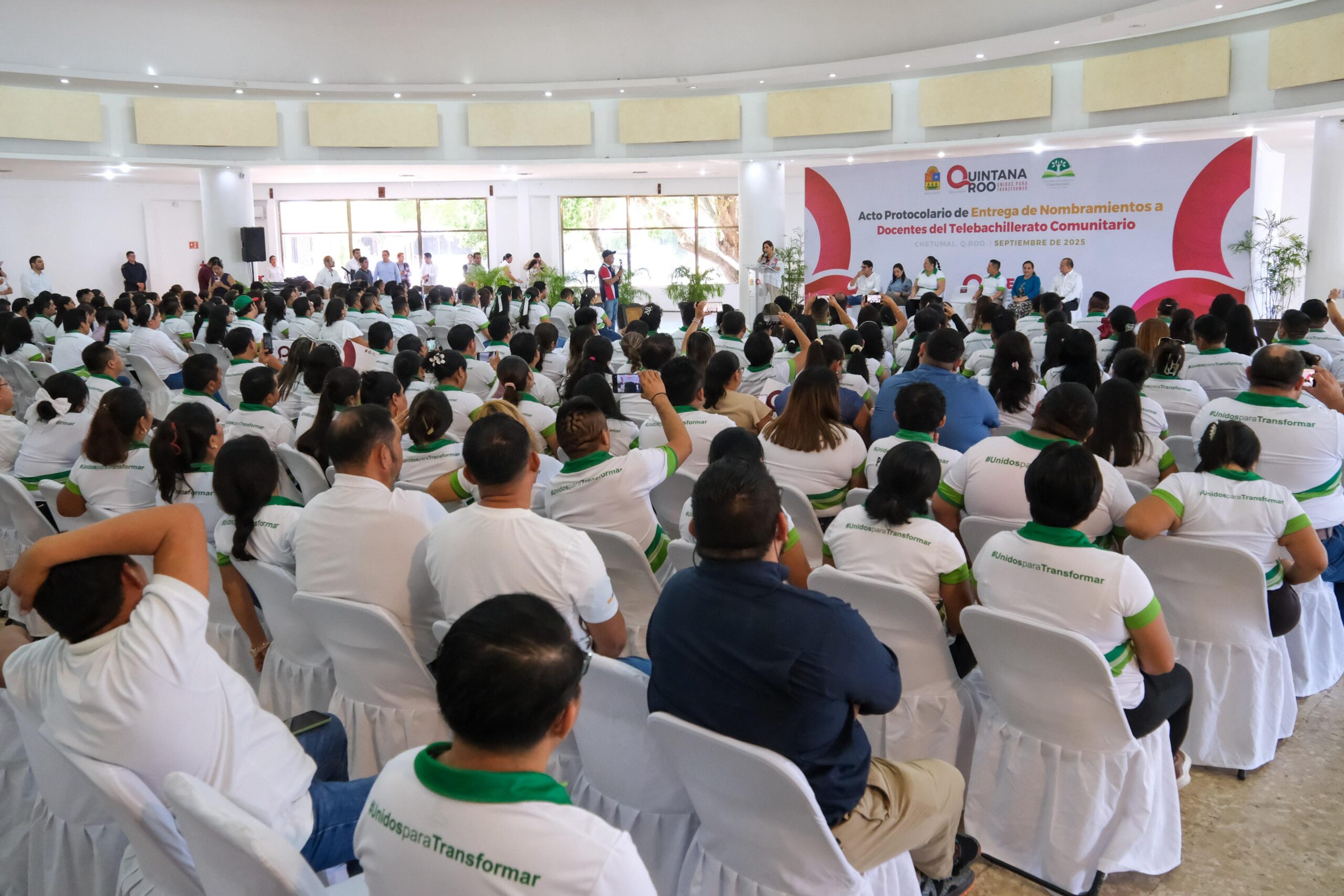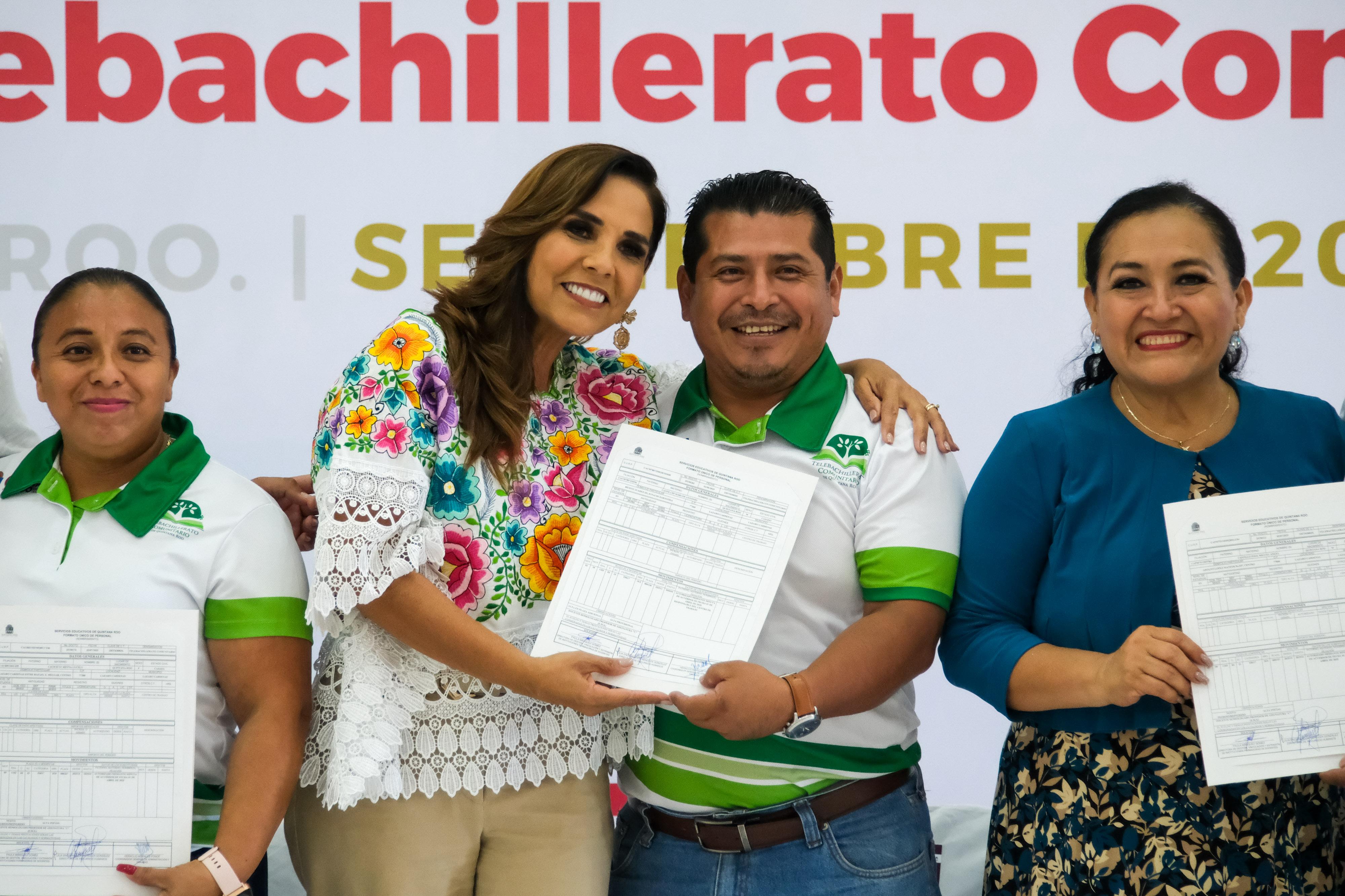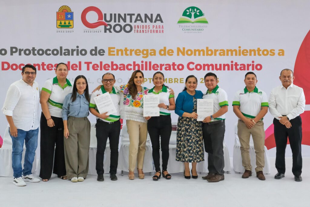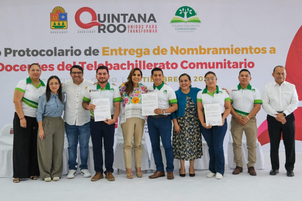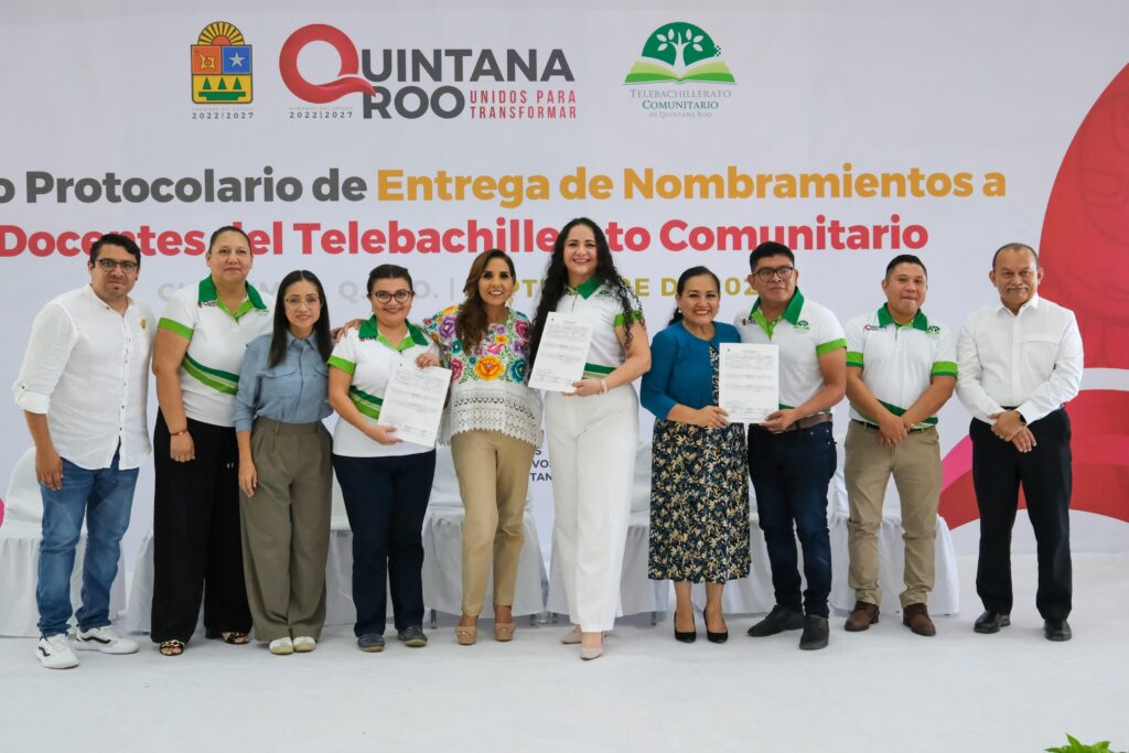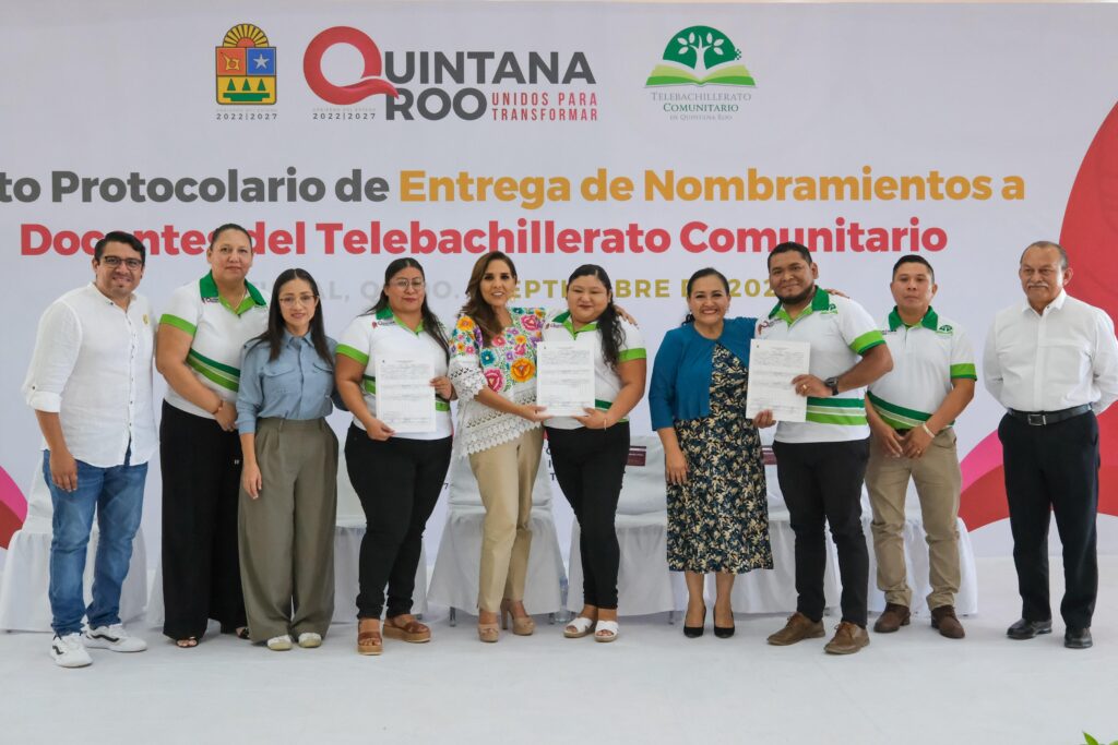 Chetumal.- La gobernadora Mara Lezama Espinosa acompañada por la secretaria de Educación en Quintana Roo, Elda Xix Euán, entregó nombramientos de base a docentes del Telebachillerato Comunitario, dando certeza jurídica a su situación laboral, luego de 13 años de trabajo bajo contratos y se reconoce su vocación, compromiso y dedicación con las y los jóvenes de aproximadamente 170 comunidades rurales del estado.