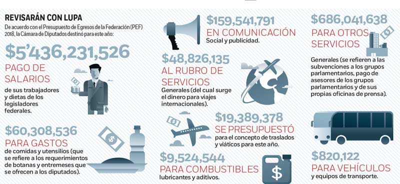 De acuerdo con el Presupuesto de Egresos de la Federación (PEF) 2018, la Cámara de Diputados destinó este año cinco mil 436 millones 231 mil 526 pesos al pago de salarios de sus trabajadores y dietas de los legisladores federales; 60 millones 308 mil 536 pesos para gastos de comidas y utensilios, que se refiere a los requerimientos de botanas y entremeses que se ofrecen a los diputados; en Comunicación Social y publicidad se canalizan 159 millones 541 mil 791 pesos.