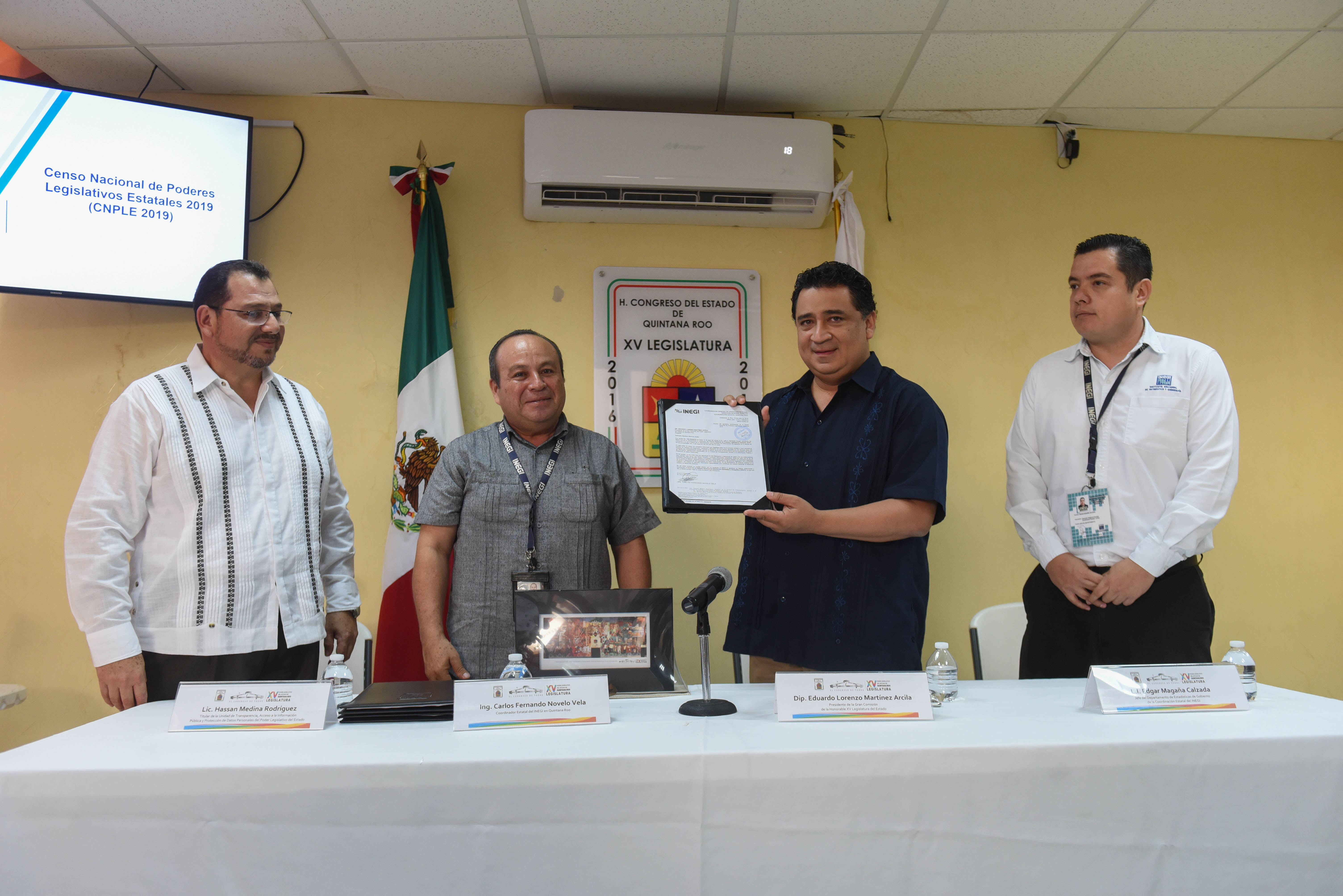 El Coordinador estatal del INEGI en Quintana Roo, Carlos Fernando Novelo Vela, acompañado por Edgar Magaña Calzada, jefe de departamento de Estadísticas de Gobierno de la Coordinación Estatal del INEGI, entregaron al presidente de la Gran Comisión, el diputado Eduardo Martínez Arcila, los documentos que acreditan el cumplimiento de la entrega de la información que, señaló el funcionario, constó de 140 preguntas en dos módulos.