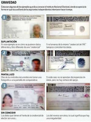 Al dar cuenta de las irregularidades en las que incurrieron Margarita Zavala, Jaime Rodríguez Calderón y Armando Ríos Piter, el INE detectó que hubo simulación de credenciales para votar, es decir, que a miles de credenciales de cualquier índole les pusieron datos correctos de electores para entregarlas como firmas en apoyo a sus candidaturas independientes.