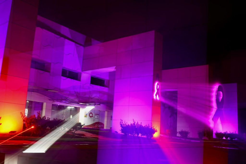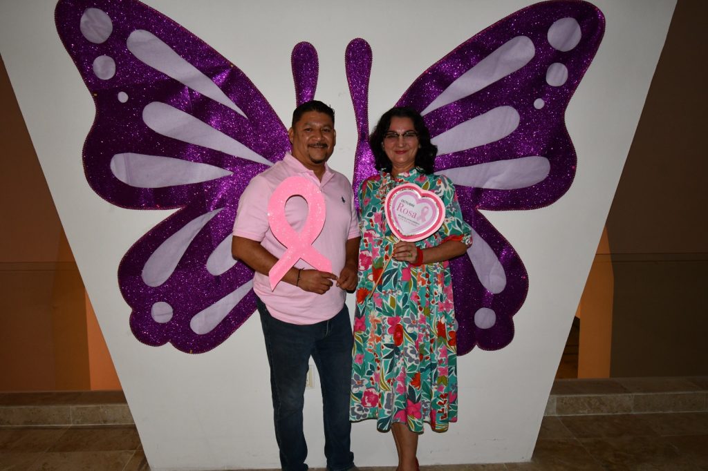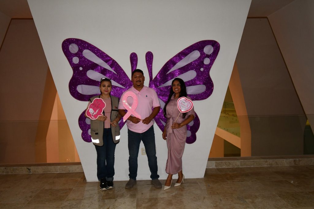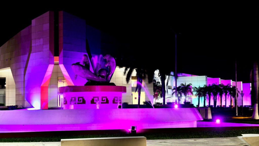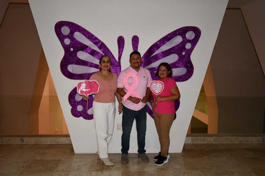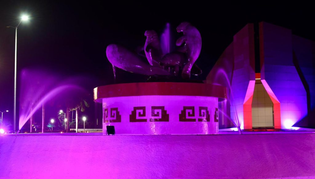 En señal de apoyo, diversos espacios emblemáticos de Chetumal y del Estado se iluminaron de color rosa, entre ellos la Megaescultura, el Centro Internacional de Negocios y Convenciones, la sede de las oficinas de AGEPRO y la Fuente del Manatí, como símbolo de esperanza, unión y compromiso con la vida.