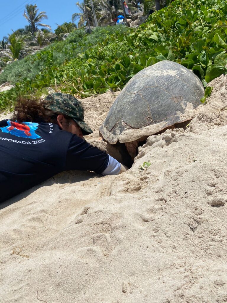 En este segundo desove la tortuga de 91 centímetros de largo y 82 de ancho, depositando 82 huevos resguardando el nido en el corral de protección para que posteriormente el equipo de tortugueros supervise el regreso de la especie al mar.