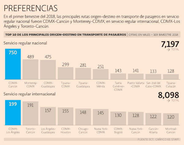 Durante enero-febrero de este año, la ruta CDMX-Cancún movilizó 750,000 pasajeros, lo cual representó un crecimiento de 6.1% respecto del mismo periodo del 2017 y es el volumen más grande de todas las rutas al interior de la República Mexicana.