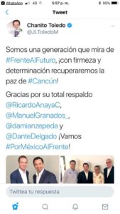 “Somos una generación que mira de frente al futuro. Con firmeza y determinación recuperaremos la paz de Cancún”, posteó Toledo en su cuenta en la red social de Twitter, con lo que anticipa su participación en él proceso electoral de julio.
