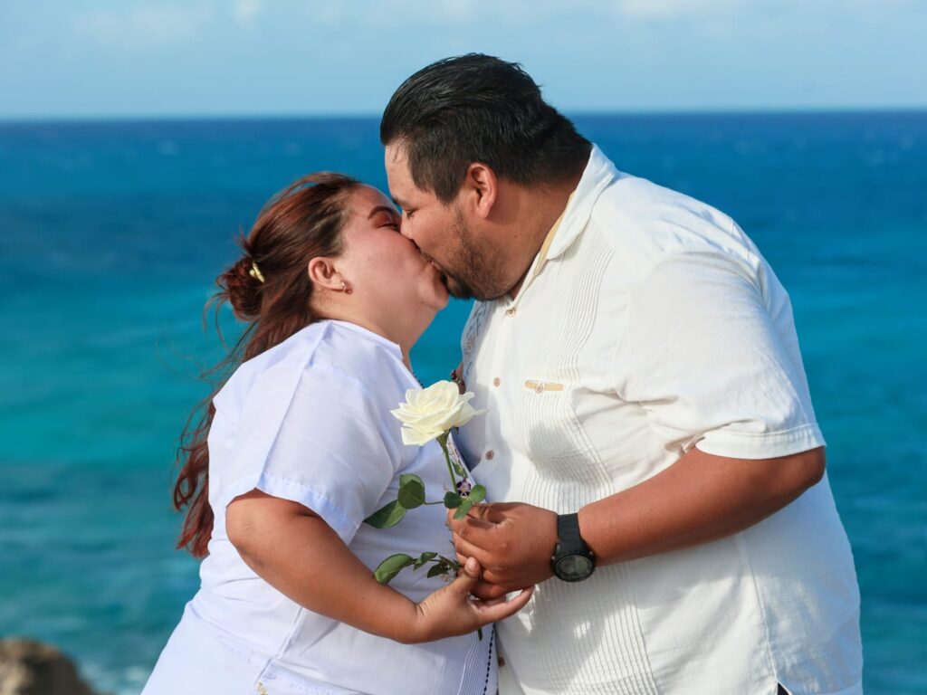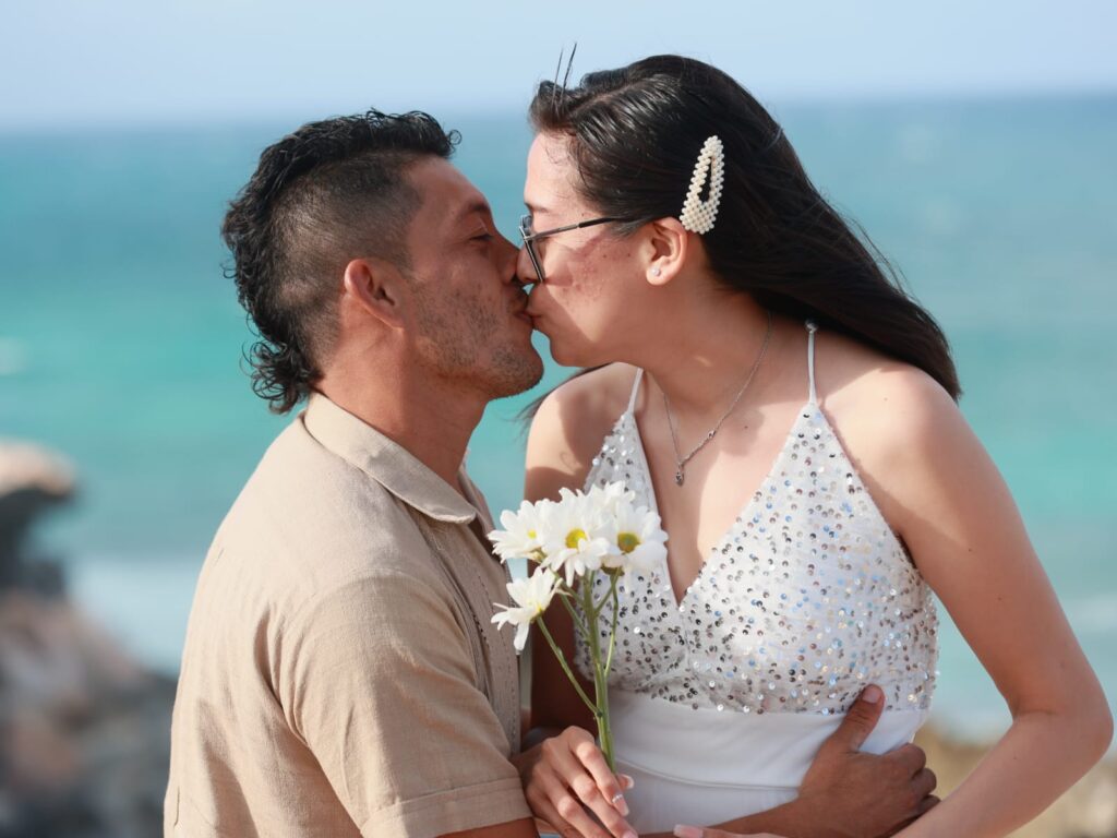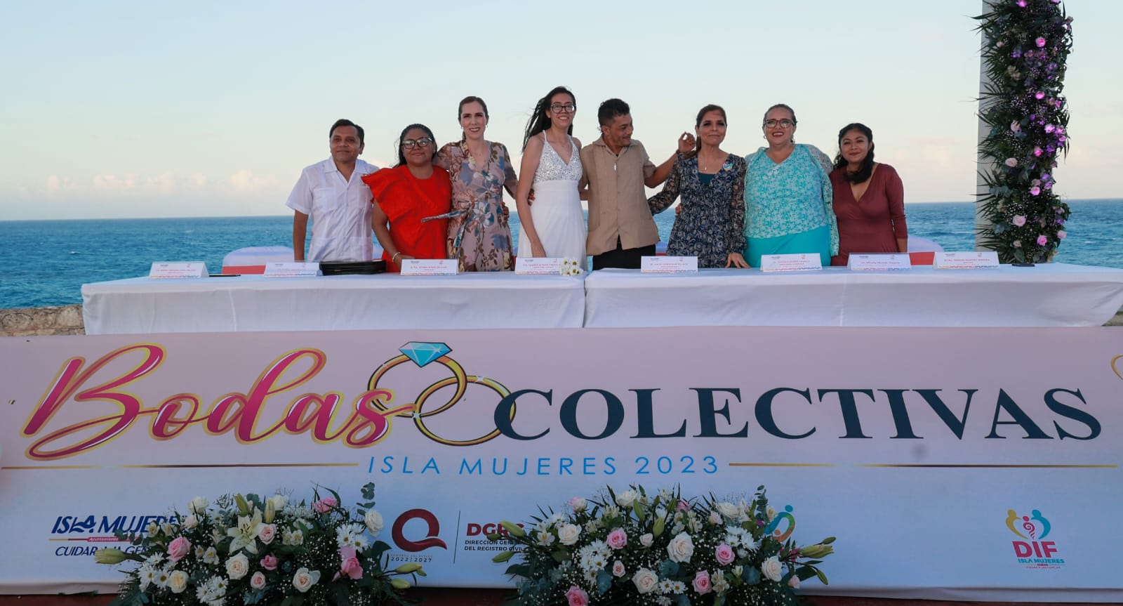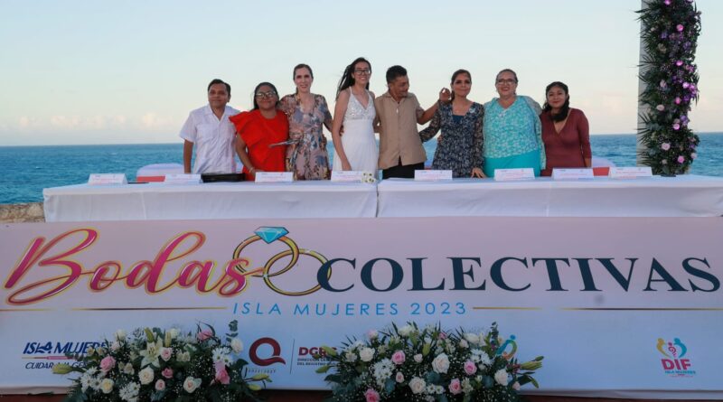 Isla Mujeres, Quintana Roo, 22 de febrero de 2023.-A través del programa estatal Bodas Colectivas legalizaron su unión 50 parejas isleñas, teniendo como marco el bello mar Caribe desde Punta Sur.